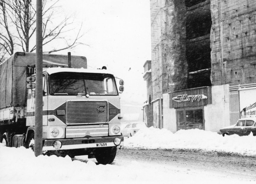 Returlast efter att ha lossat Scaniagodset blev ofta styckegods som lastades i Hagen, Ruhrområdet, Västtyskland. Vid Schenkers Scandinaviencentral i Hagen träffade jag ofta chaufförer som körde för Evensen o Söner i Norge. Här syns en av deras bilar med chaufför Kåre. Killen som sitter på kofångaren är min lillebror Mats som följde med på denna resa. Detta är just den bil som renoverats och börjar synas på olika veteranrallyn.