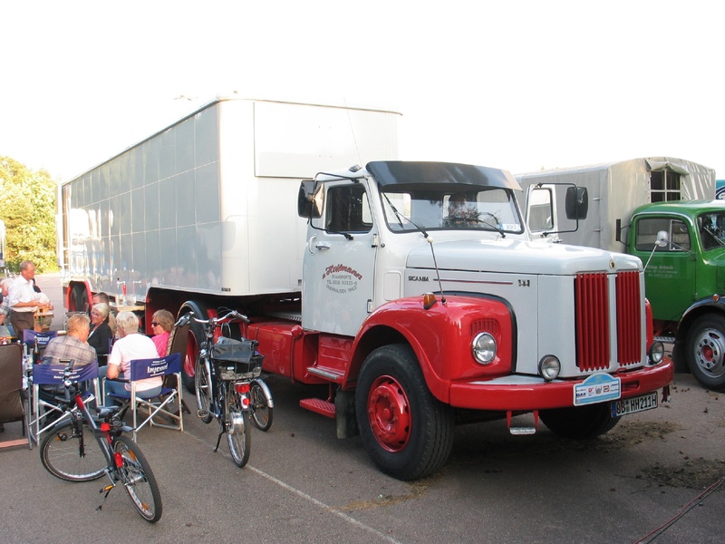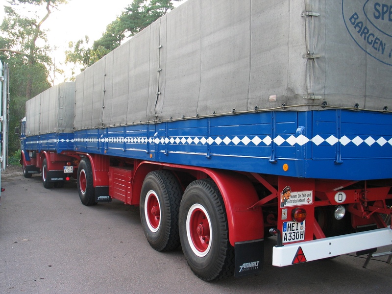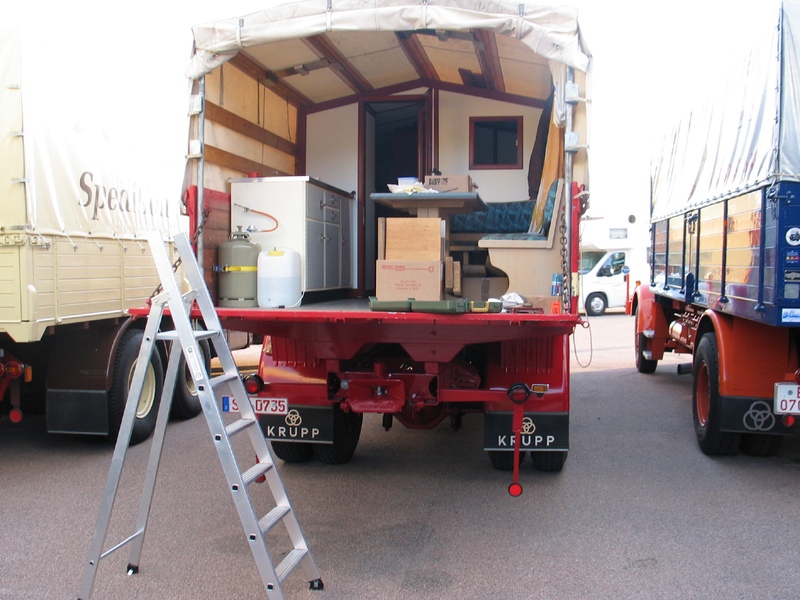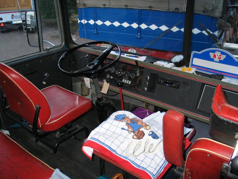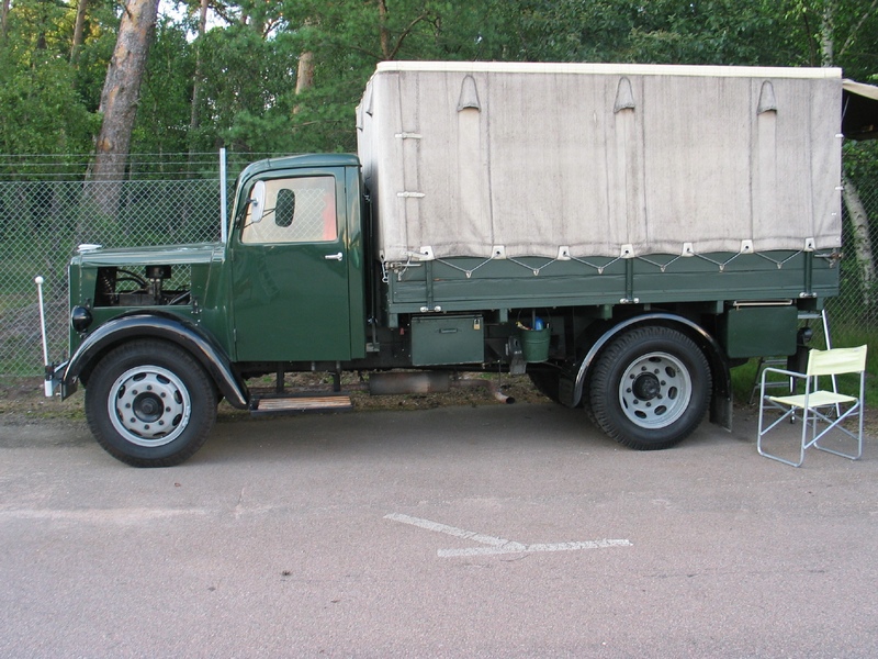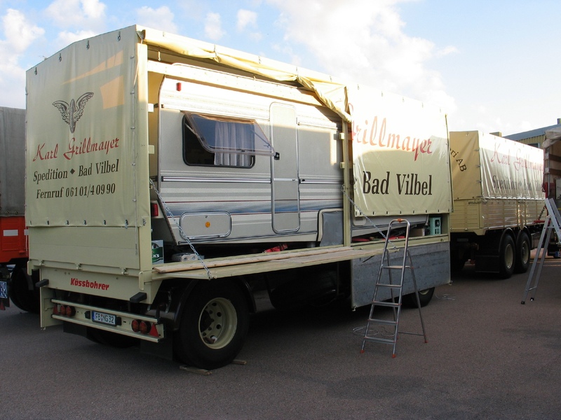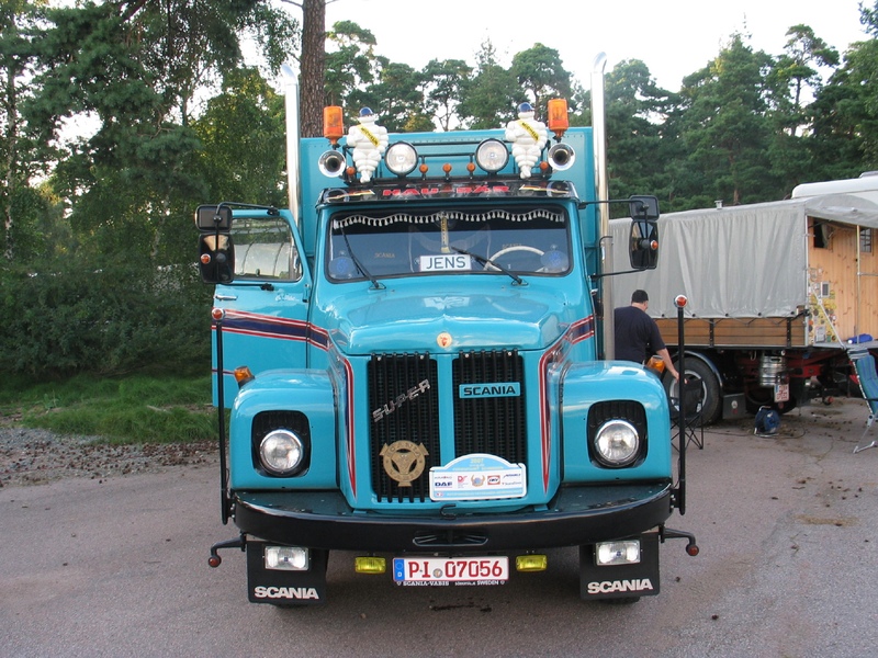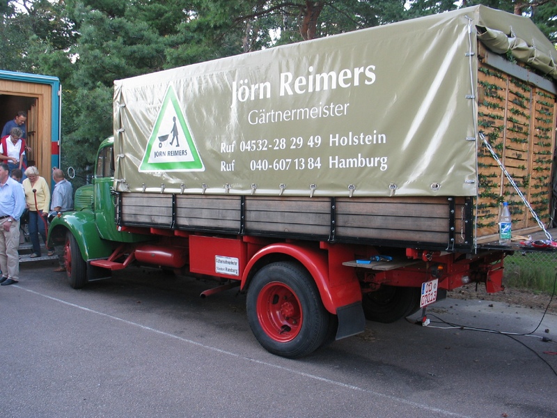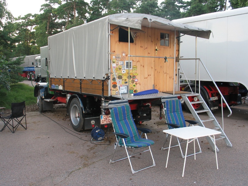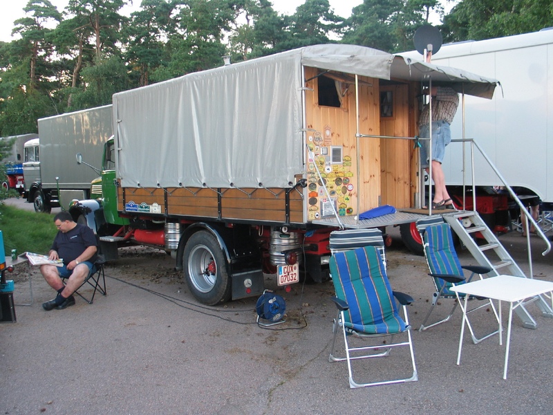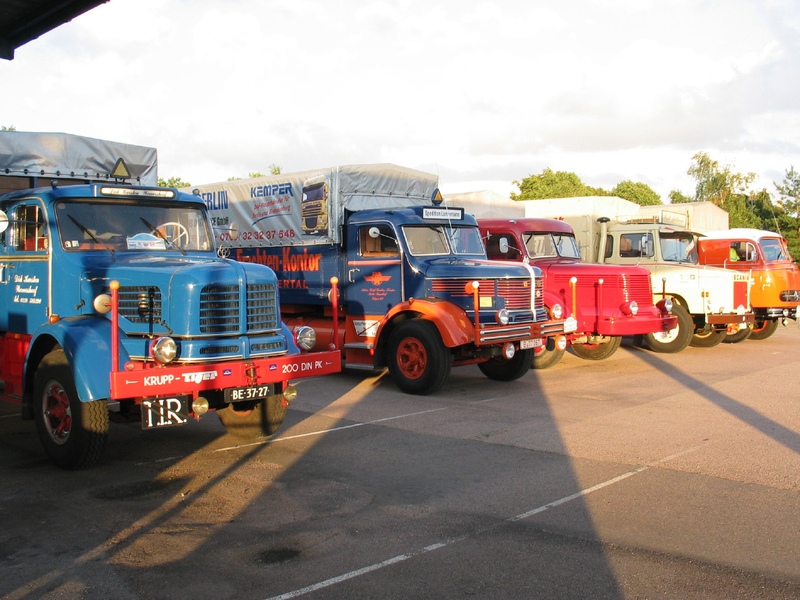 Sent på kvällen den 18 juli ringer Stefan Bengtsson och meddelar att tyskar har intagit gamla bussgarage platsen i Helsingborg. Jag skyndar givetvis dit och hinner precis ta några foton innan solen går ner. Här samsas märken som Büssing, Henschel, Krupp, m fl, märken som ej syns på vägarna idag. Kruppmotorn är en tvåtaktsdiesel. Och så har man försökt "förtyska" en Scania till gammalt tyskt fjärrekipage - kanske lite mindre autentiskt men kul ändå - längdbegränsningen i Tyskland efter kriget innabar att alla fjärrekipage var frambyggda. Se också hur man löst och kamoflerat logifrågan. Bier und Tanzmusik. Visst verkar det gemytligt . . .