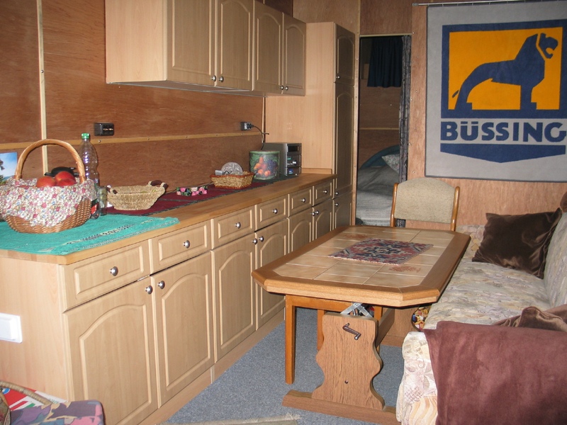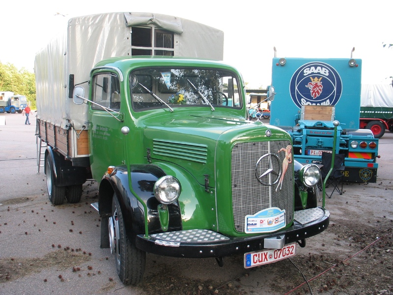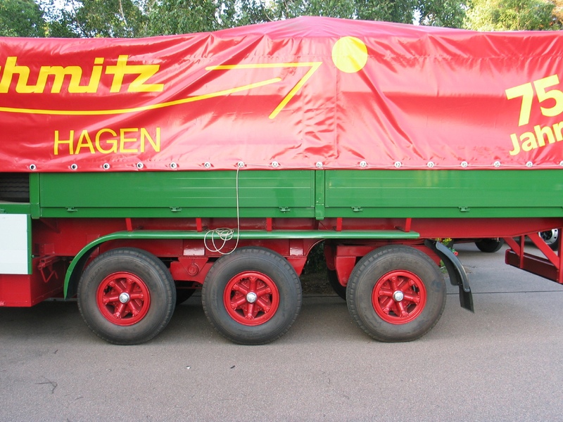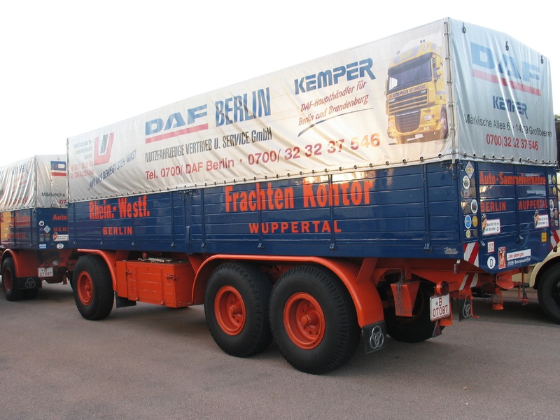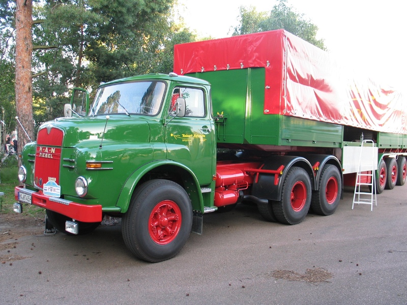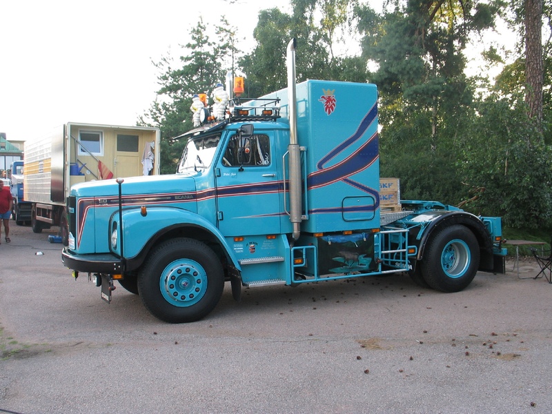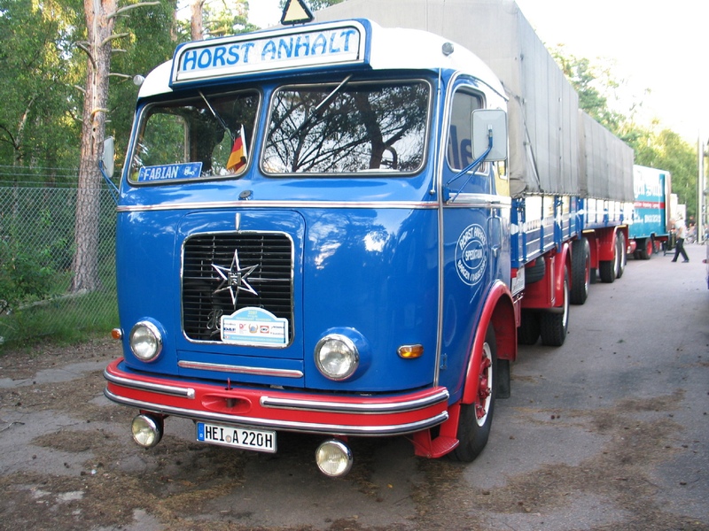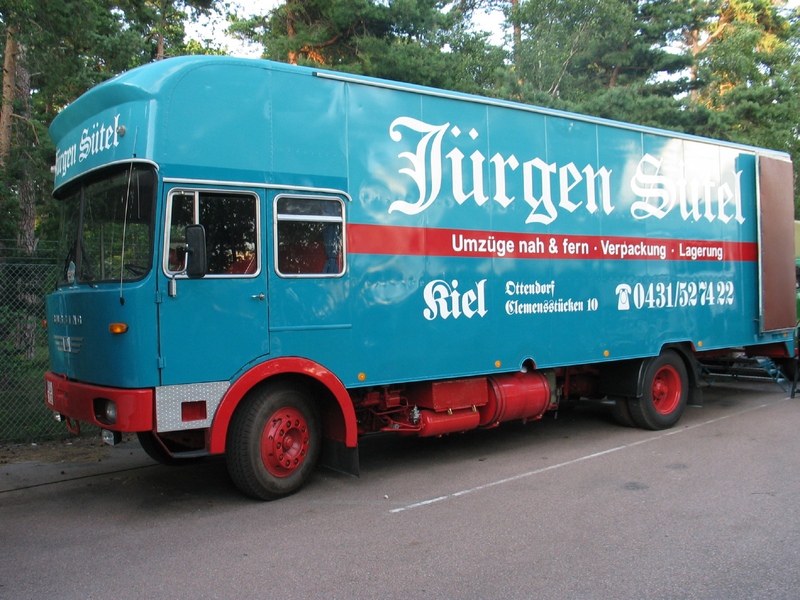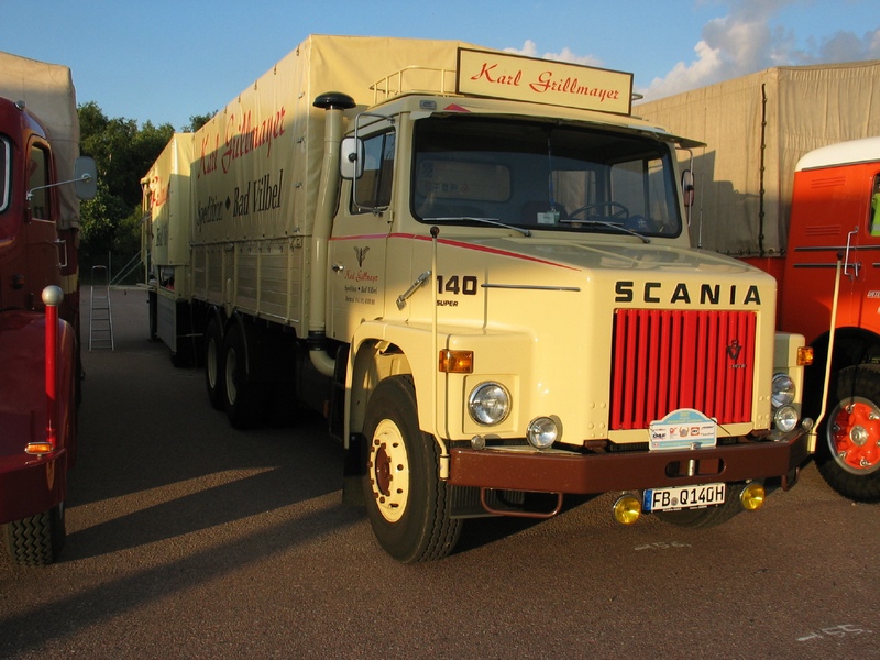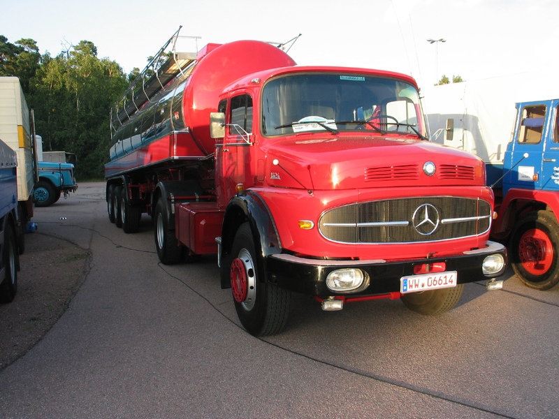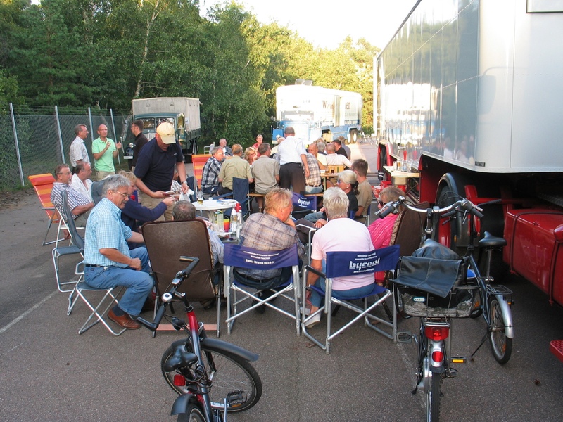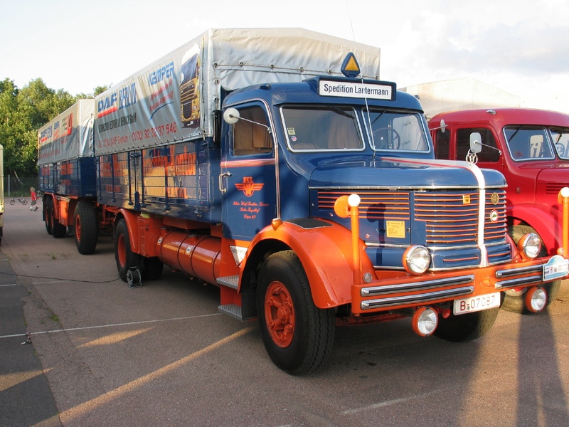 Sent på kvällen den 18 juli ringer Stefan Bengtsson och meddelar att tyskar har intagit gamla bussgarage platsen i Helsingborg. Jag skyndar givetvis dit och hinner precis ta några foton innan solen går ner. Här samsas märken som Büssing, Henschel, Krupp, m fl, märken som ej syns på vägarna idag. Kruppmotorn är en tvåtaktsdiesel. Och så har man försökt "förtyska" en Scania till gammalt tyskt fjärrekipage - kanske lite mindre autentiskt men kul ändå - längdbegränsningen i Tyskland efter kriget innabar att alla fjärrekipage var frambyggda. Se också hur man löst och kamoflerat logifrågan. Bier und Tanzmusik. Visst verkar det gemytligt . . .