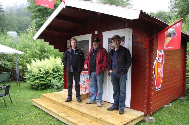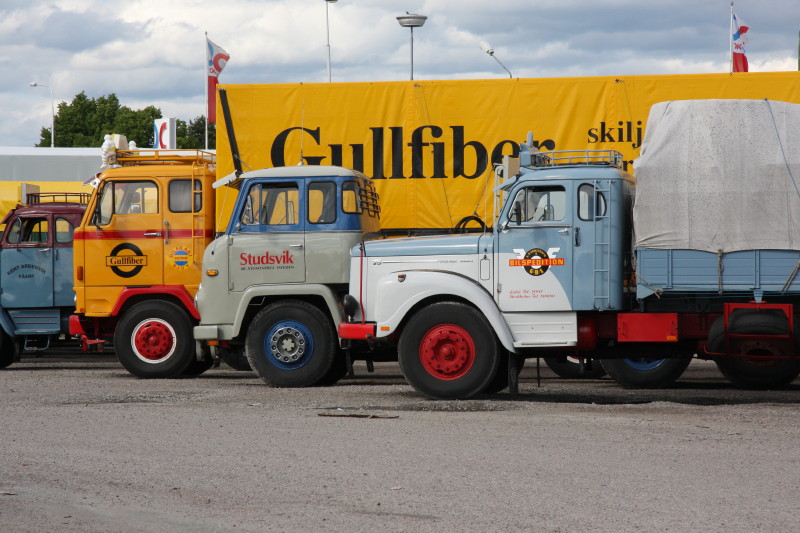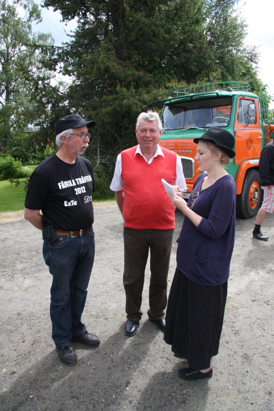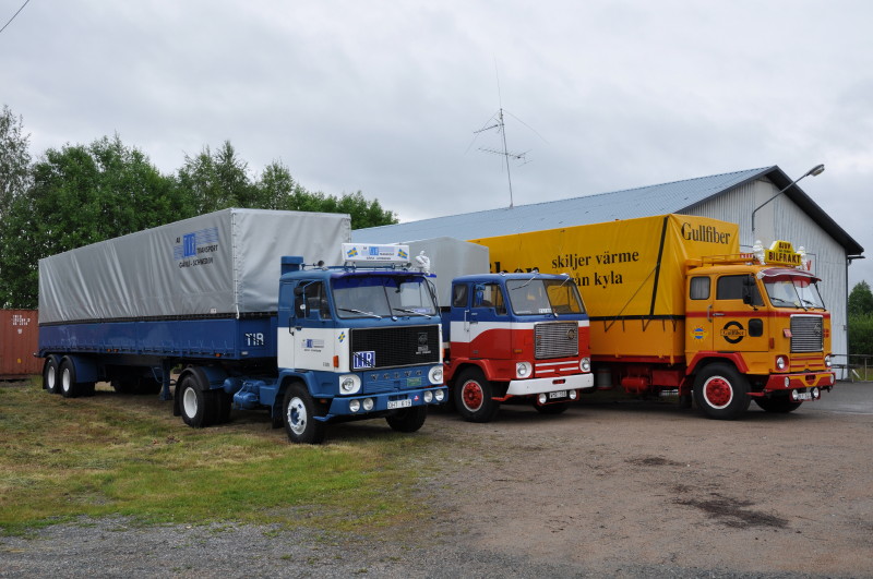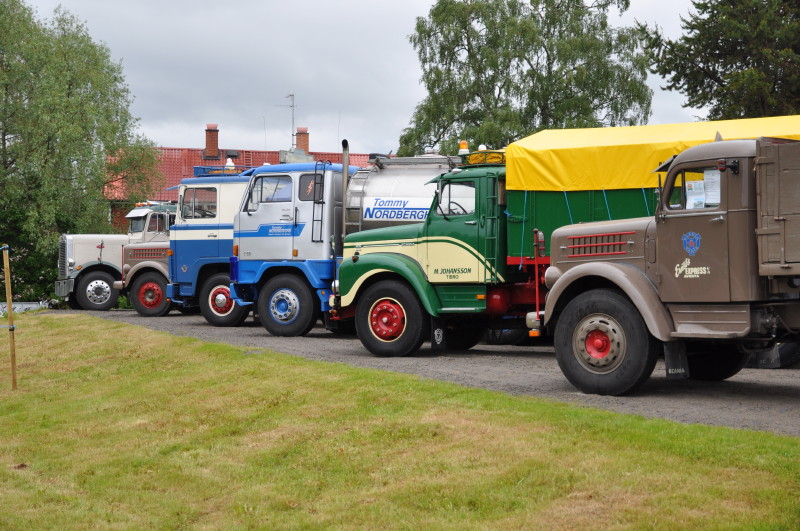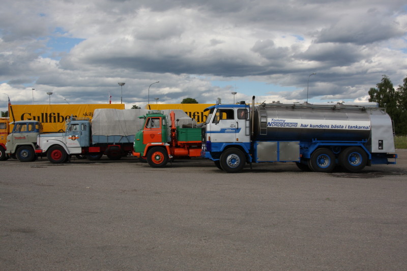 Sedan rullade veteranlastbilarna vidare mot Färila. Frampå eftermiddan hade alla ekipagen nått fram till huvudmålet: www.truckraceinfala.se hyttebovägen 1 Färila helt intill RV 84 1 km väster om Färila. Här ställde vi upp lastbilarna på parad för helgen och de kom på så vis att bli en veteranlastbilsutställning. Utställningen blev vår utgångspunkt under helgen, Ingemar Rydh ställde upp med sin fina veteranbuss och skjutsade oss till olika aktiviteter.