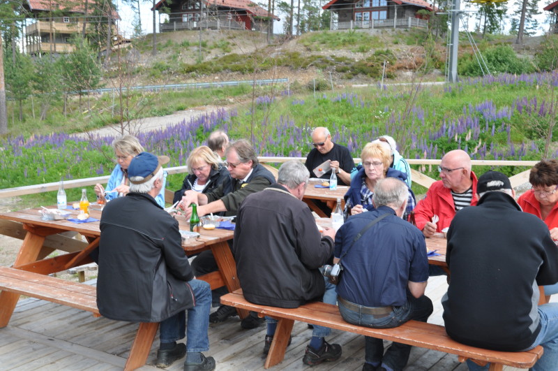 Bussen tog oss sedan uppför en slingrande backe som slutade uppe vid Alpbyn där vi skulle avnjuta den medhavda matlådan som bestod av rostbiff och potatissallad. Utsikten är över landskapet var fantastisk och går inte av för hackor.