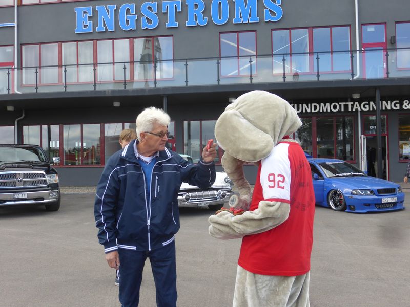 På Lördagen full rulle med ett mycket omfattande program (omöjligt att bevaka allt med kameran) varav några kan nämnas: Drifting, KTM stunt, Stridsuppvisning men hemvärn och stridsvagn S (pensionär), veteranlastbilskortege plus mycket mer. Kortegen gick inte denna gång genom stadens centrumkärna där lördagshandeln pågick för fullt utan en sväng via förortscentra. Bilarna körde ut på rundan efter en presentation av den kände och kunnige Thorbörn.