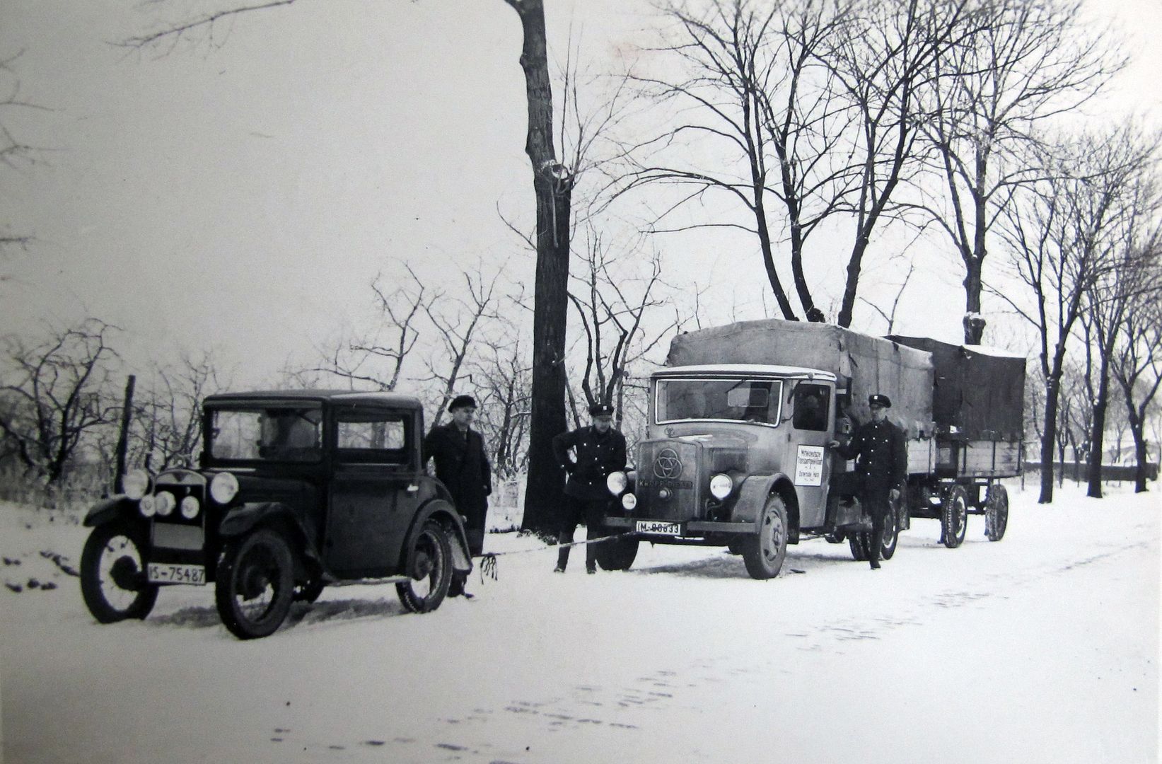 Den bilden visar en Krupp diesel med en liten personbil framför. Antar den nedre bilden visar busschassier av fabrikatet Mercedes Benz. Intressant är styrningen av boggiaxeln redan för 75 år sedan.
