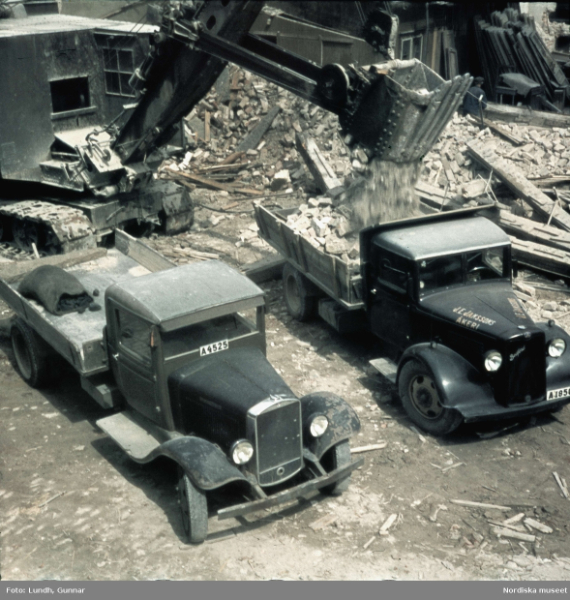 En färgbild. Grävskopa från AB Armator i arbete. Rivning av hus. En lastbil från J E Janssons åkeri lastas.
